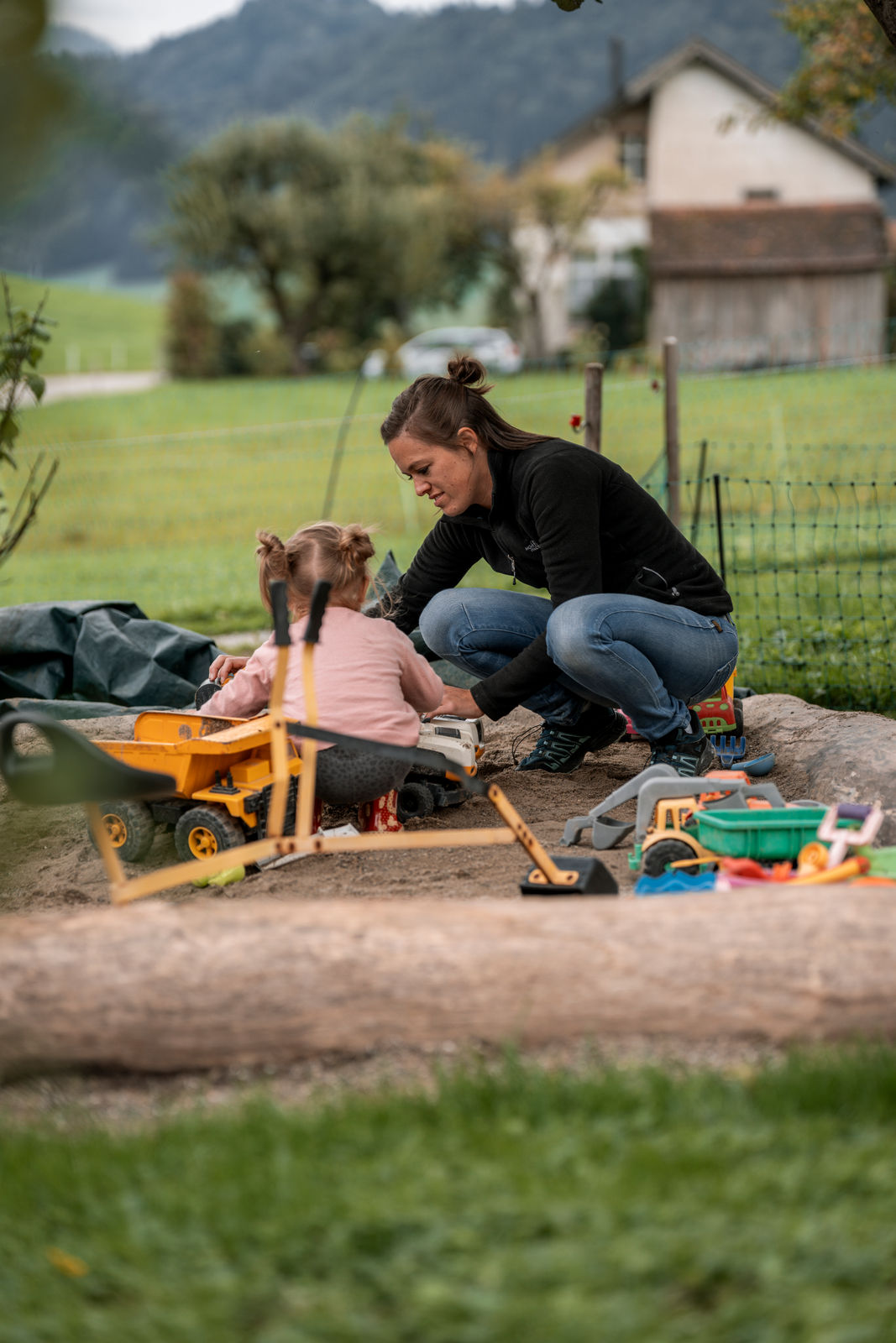 Mein Herzensprojekt ist es, Kindern das Leben auf unserem Bauernhof näherzubringen. Hier dürfen sie Kühe, Geissen, Hühner, Hasen und Katzen kennenlernen, streicheln, füttern und beobachten. Vor allem aber dürfen sie draussen sein: spielen, entdecken, matschen, staunen. Denn genau dort – in der Natur – lernen Kinder am schönsten und am ehrlichsten.“